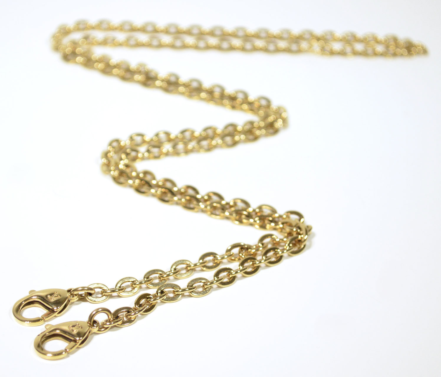 Edles Design: Hochglanzpolierte Gliederkette mit LV-gravierten Karabinern – ein luxuriöses Detail, das jedem Look das gewisse Etwas verleiht.