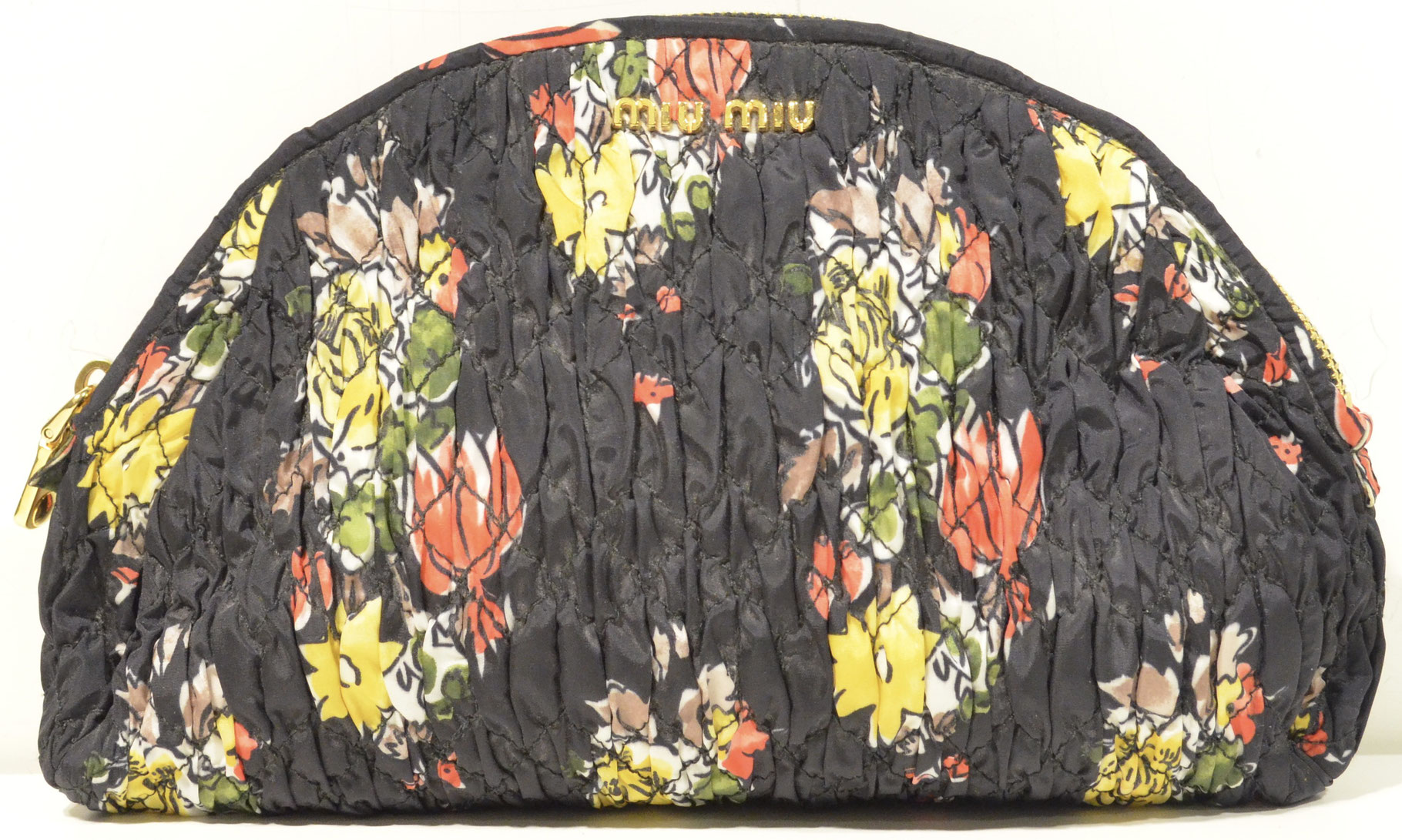Miu Miu Clutch mit floralem Print – elegantes Design in Schwarz mit farbenfrohen Blüten für einen stilvollen Auftritt.